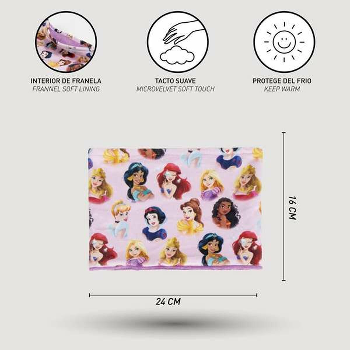 La braga de cuello Disney Princess es un accesorio funcional y decorativo diseñado para proteger del frío durante la temporada de invierno, especialmente indicada para niñas por su color rosa atractivo y característico de la línea Disney. Fabricada en 100 % poliéster, ofrece una textura suave y un tacto agradable, además de garantizar una alta resistencia y facilidad de lavado, lo que aporta durabilidad y mantenimiento sencillo. Su talla S está pensada para ajustarse correctamente a niñas, proporcionando comodidad sin restricción, al tiempo que mantiene una buena cobertura y protección térmica en la zona del cuello. Esta braga se adapta bien a actividades cotidianas y escolares en climas fríos, combinando funcionalidad con el estilo representativo de Disney Princess, que resulta familiar y atractivo para el público infantil. Su confección permite conservar el calor corporal y evitar la entrada de aire frío, colaborando con la prevención de molestias por bajas temperaturas. En resumen, esta braga de cuello reúne comodidad, protección térmica y diseño infantil en una prenda práctica y fácil de usar durante el invierno.