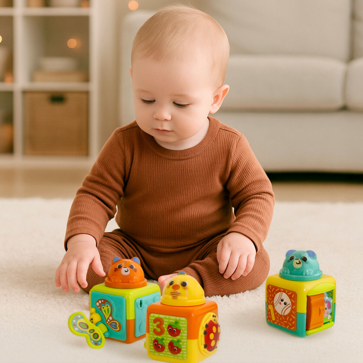 - Set de 3 cubos apilables: cada cubo incluye un simpático animal giratorio en la parte superior con divertido sonido clic-clac